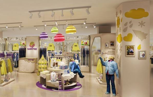 Ceiling can create the beauty of children’s clothing store, interaction design, lighting in the space, create a have no shopping environment. Appropriate ceiling decoration can heat insulation, sound insulation, pipe, cover beams etc, so it is very important to children’s clothing store in the ceiling decoration. The ceiling design should consider the material, color, height, reflect modern feeling, pay attention to integral collocation, make colour elegant.